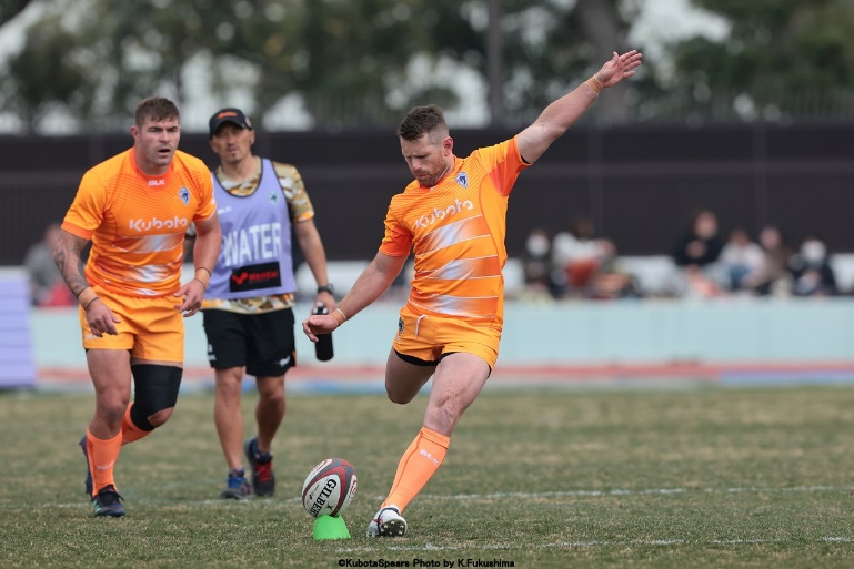 11分には、ここまでラインブレイクを続けていた右サイドでリカス選手が抜け出したところでラックを作ると、フォーリー選手は逆の左サイドライン際に控えていた木田選手にキックパス。 これのボールを外から切り込むようにしてキャッチした木田選手が取り、そのままボールを抑えトライ。