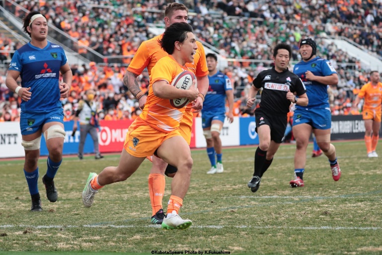 16分にはトライを返されるものの、23分にはまたもや根塚選手が抜け出したところでマキシ選手に繋ぎ取り返します。