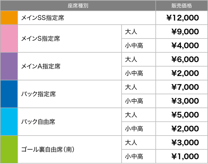 | 販売席種 | メインSS指定席、メインS指定席、メインA指定席 バック指定席、バック自由席 ゴール裏自由席 |