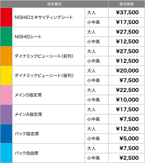 | 販売席種 | NISHIOエキサイティングシート(特典付き)、NISHIOシート ダイナミックビューシート(前列)、ダイナミックビューシート(後列)、 メインS指定席、メインA指定席、バック指定席、バック自由席 |