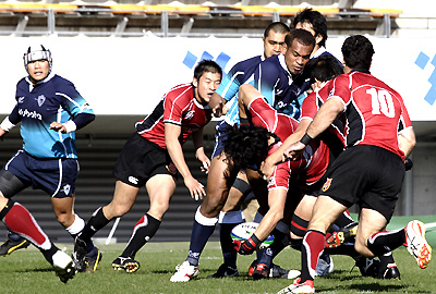 前半は風下の条件の中、立ち上がりに課題であるディフェンスが機能して、東芝の攻撃を粘り強いタックルで何度も跳ね返しました。
