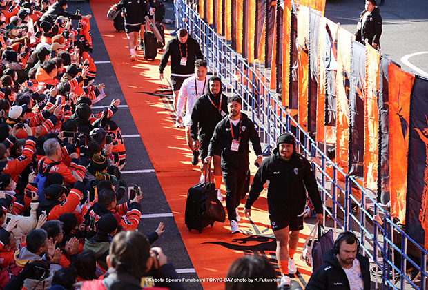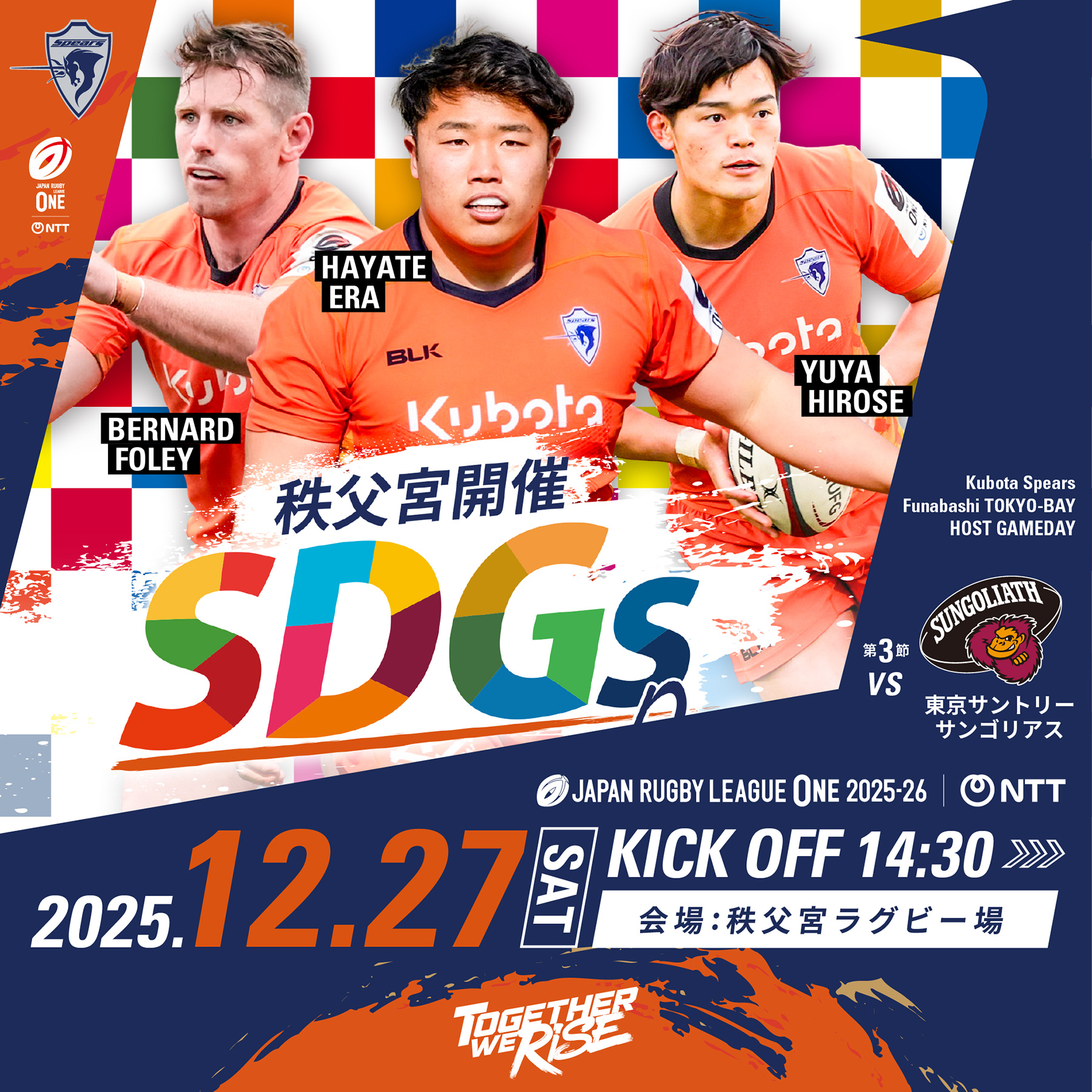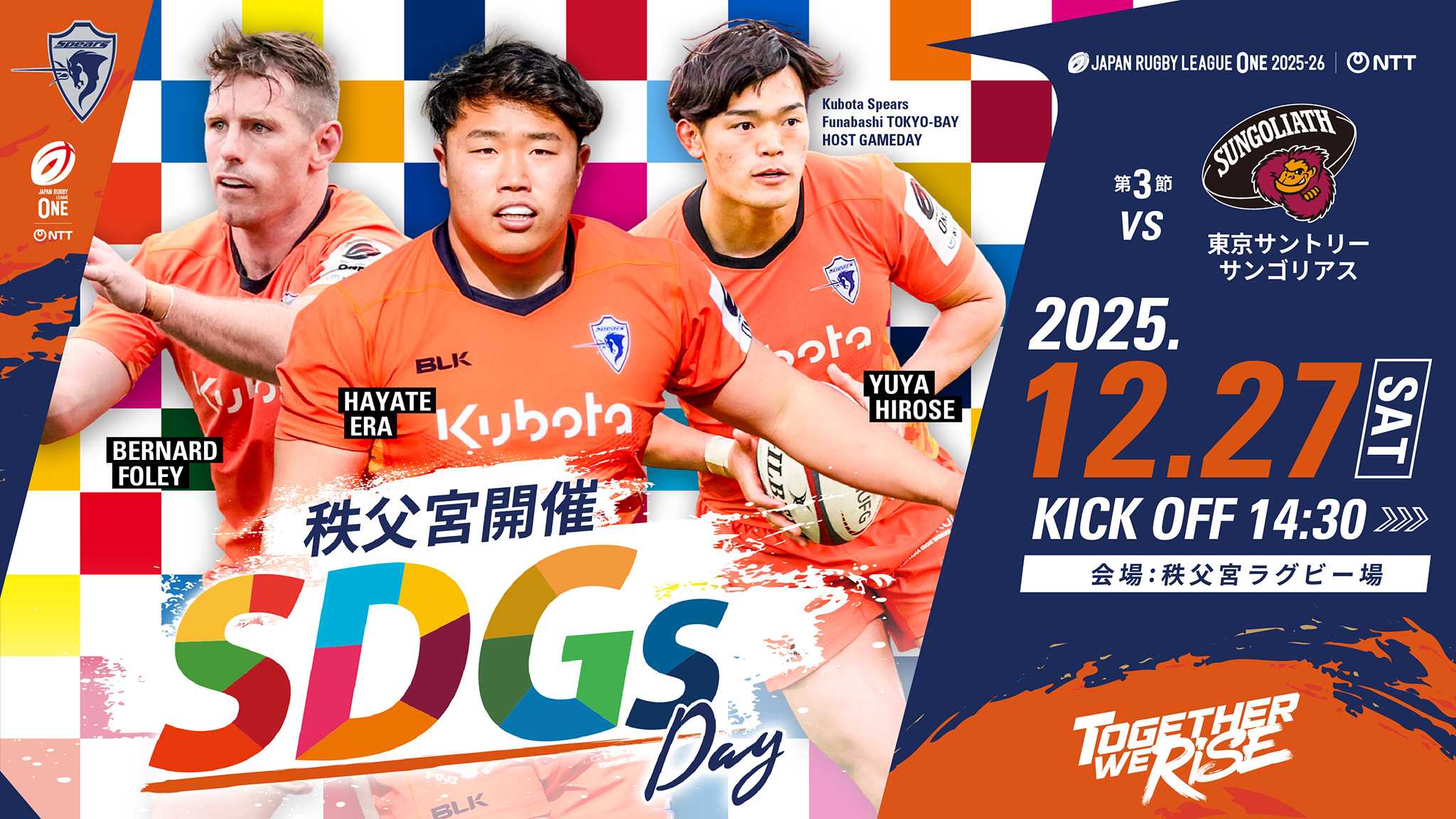 クボタスピアーズ船橋・東京ベイの第3戦は、昨季6位の東京サントリーサンゴリアスと対戦します。昨シーズンの同カードの戦績は2勝1分でスピアーズが優勢。しかし、相手チームの過去の戦績や充実した戦力を見れば、どちらに転ぶかわからない勝負の一戦になることでしょう。この試合の注目ポイントのひとつは、成長著しい25歳以下の若手選手たち。スピアーズ入団後、日本代表にも選出された江良選手、為房選手、ヴァンジーランド選手、廣瀬選手といった選手たちをはじめ、この1~2年でさらに逞しくなった選手たちが、聖地・秩父宮ラグビー場でプレーします。こうしたフレッシュなメンバーがフィールドを躍動すれば、それを活かすのが経験豊かな中堅~ベテラン勢。15人のメンバーの歯車が合ったアタック、全員がひたむきにタックルするディフェンスなど、スピアーズらしい一体感のあるラグビーで2025年最後のラグビー観戦を締めくくりましょう!