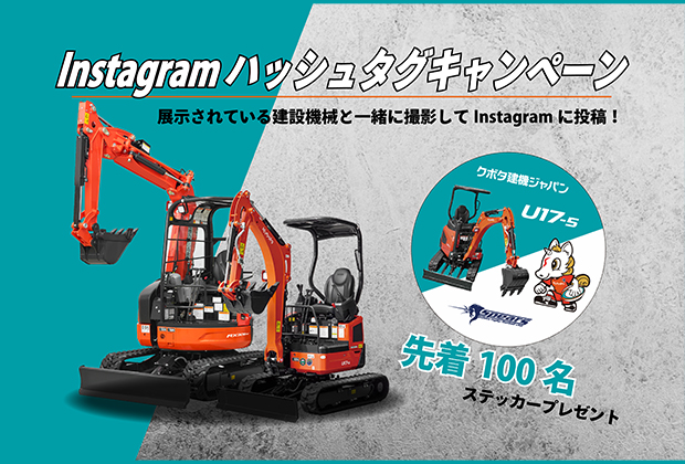 展示されている建設機械と一緒に撮影して、#クボタ建機ジャパン #クボタスピアーズのハッシュタグをテキスト内にいれてInstagramで投稿しよう!