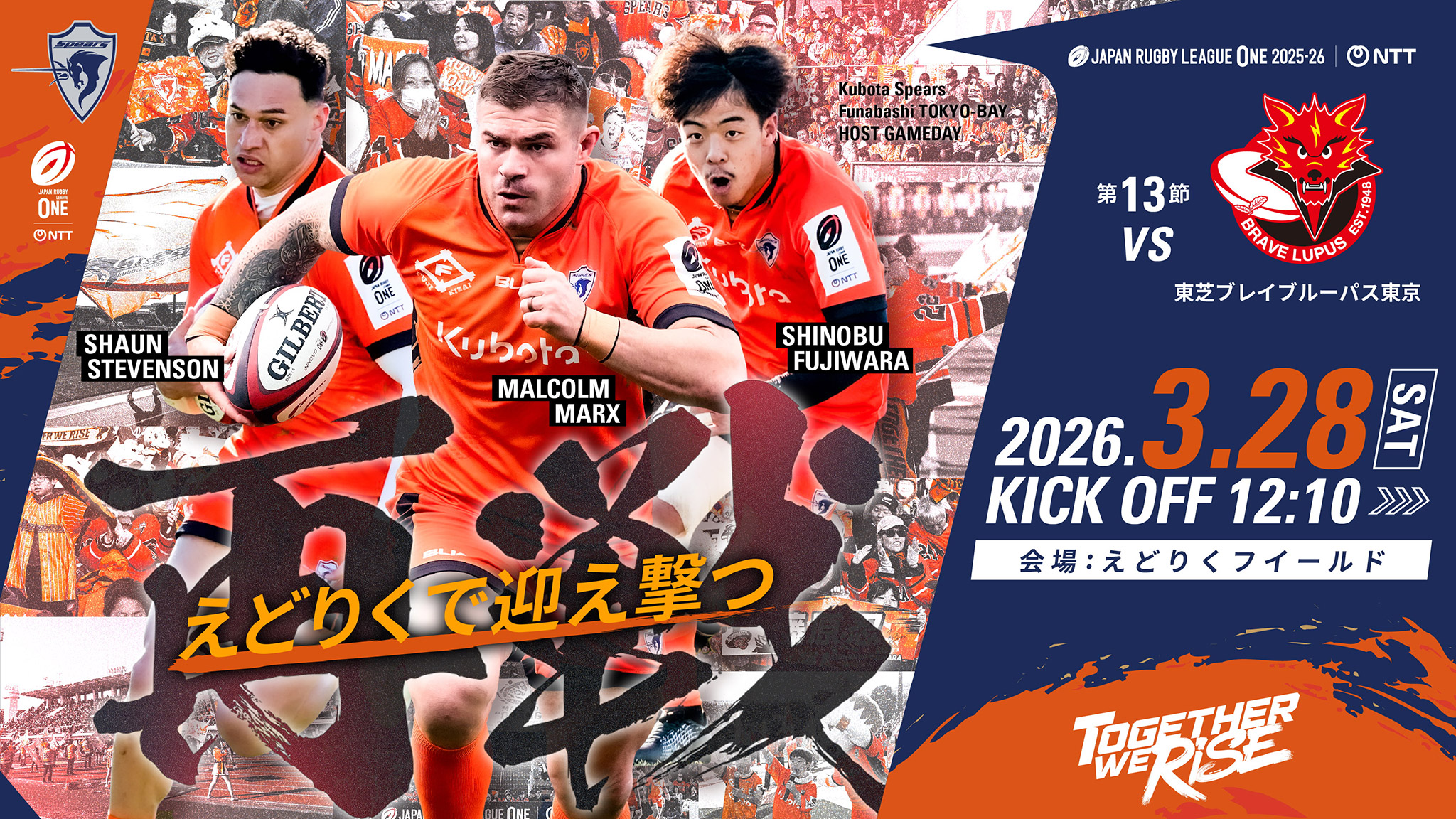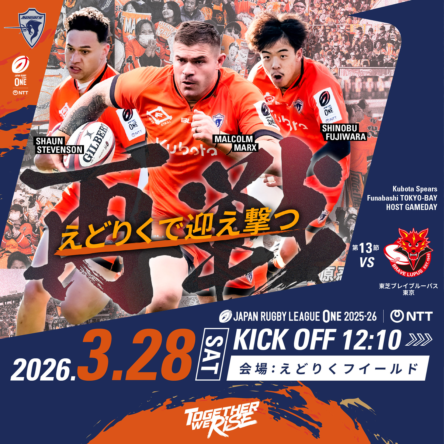 シーズンも後半戦に入った第11節は、昨季優勝チームである東芝ブレイブルーパス東京との対戦です。前回の対戦となった第6節では、ロースコアゲームの接戦の末に後半37分に勝ち越しましたが、終了間際にトライを許して惜敗となりました。ブレイブルーパスは、ここ5試合勝利できていない難敵ですが、点差は常に5点差以内と拮抗した戦いが続いています。迎え撃つ舞台は「スピアーズえどりくフィールド」。スピアーズはこのホストスタジアムで、オレンジアーミーの声援と共に必勝を誓います。昨シーズンの決勝同カードがえどりくで!今季えどりく最大のビッグマッチをぜひ会場でご覧ください。