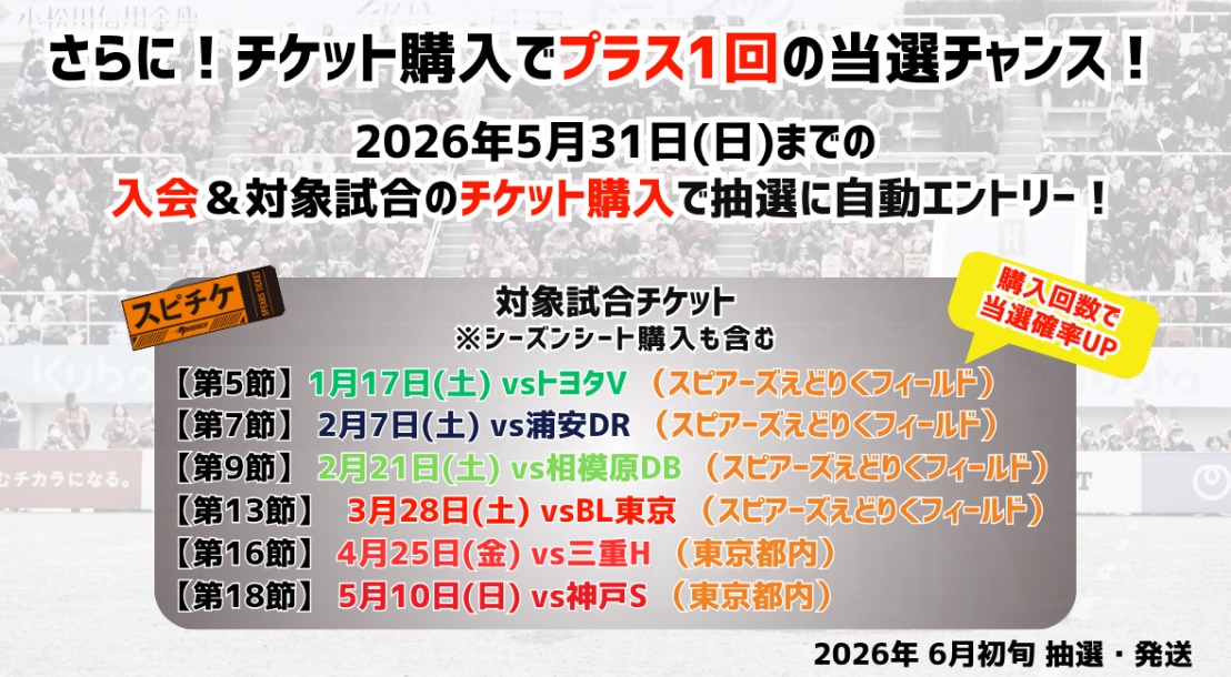| 第4回 | 2026年5月31日(日)までの ご入会者かつ対象試合のチケット購入者 |