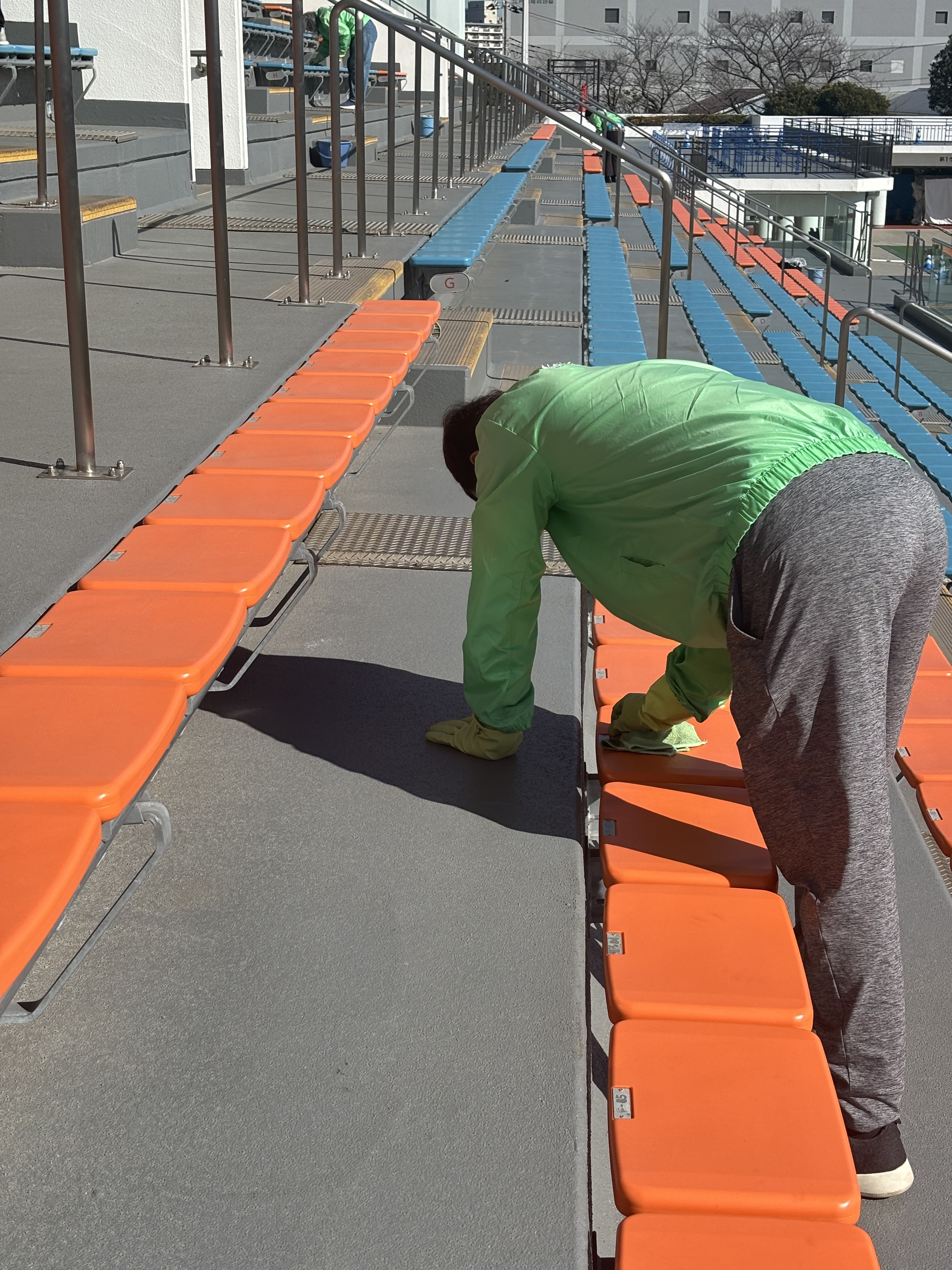 スピアーズえどりくフィールドにご来場される方が気持ちよく観戦できるよう、スタジアム内すべての椅子を江戸川区障害者就労支援センターの皆さまに清掃していただきます。