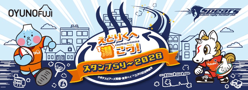 江戸川区浴場組合とのコラボ施策として、2026年1月17日(土)から5月10日(日)までの期間で、「えどりくへ湯こうスタンプらり~2026」実施します。今回で2年目となる本施策は、「スピアーズえどりくフィールド」で行われるスピアーズのホストゲームに合わせて実施され、江戸川区浴場組合に加盟する銭湯に入浴することでホストゲームの観戦ペア招待券をプレゼントします。さらにはその招待券でホストゲームに来場することで、お湯の富士とスッピーのコラボタオルもプレゼントします。ぜひこの機会に、江戸川区の銭湯とスピアーズのホストゲームで心も体も温まってください。